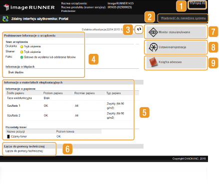 Wyświetla bieżący stan urządzenia i informacje o błędach. W przypadku wystąpienia błędu wyświetlana jest strona Informacje o błędzie [Informacje o błędach].