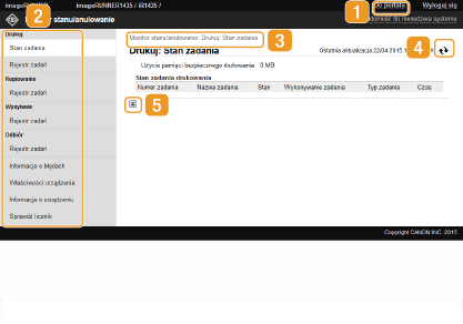 Wyświetla stan aktualnie drukowanych dokumentów, historię wydruku, kopiowania oraz wysyłania, a także otrzymane dokumenty. Umożliwia także sprawdzenie stanu urządzenia.