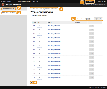 Wyświetla zakodowane numery wybierania oraz listę klawiszy jednoprzyciskowych zarejestrowanych w książce adresowej. Rejestracja lub edycja zawartości książki adresowej jest możliwa po zalogowaniu się w trybie menedżera systemu.
