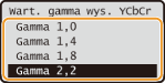 Możesz określić wartość gamma, która ma być zastosowana gdy dokumenty są skanowane w formacie pliku, który wybrałeś (Wybór formatu pliku). Wartość gamma można dostosować do ustawień monitora, na którym będą wyświetlane zeskanowane obrazy, aby mogło się to odbywać przy ustawieniach odpowiadających oryginalnym dokumentom.