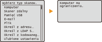 Jeżeli pole wyboru [Skanowanie] będzie zaznaczone, skanowanie dokumentów do nośników pamięci USB, wiadomości e-mail i serwerów plików będzie wyłączone. Można również wyłączyć skanowanie dokumentów na komputery za pomocą ustawień <Komputer> i <Skaner zdalny>. Skanowanie dokumentów na komputery można jednak wyłączyć tylko dla wszystkich identyfikatorów. (Blokowanie zadań w przypadku nieznanego identyfikatora wydziału).