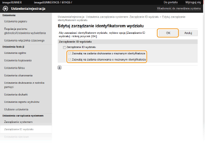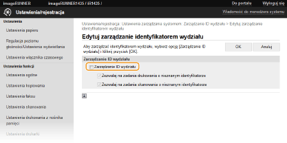 Zaznacz pole wyboru [Korzystanie z opcji Zarządzanie identyfikatorami wydziałów] i kliknij pozycję [Ustawienia] po prawej stronie.