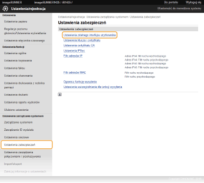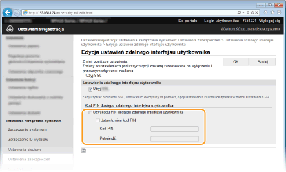 <Ustawienia zarządzania systemem> <Ustawienia zdalnego interfejsu użytkown.> <Ustawienia zabez.dost.zdal.interf. użyt.> <Włącz> Wprowadź kod PIN <Zastos.> Wprowadź kod PIN (Potwierdź) <Zastos.> .W razie inicjowania ustawień Zdalnego interfejsu użytkownikaKod PIN do dostępu do Zdalnego interfejsu użytkownika jest także inicjowany. Po inicjalizacji należy zresetować kod PIN. Inicjowanie menu