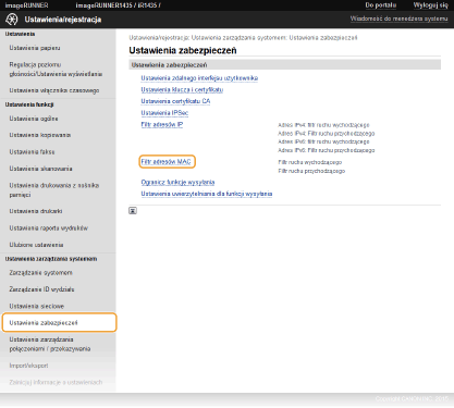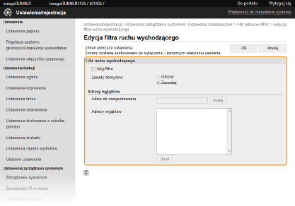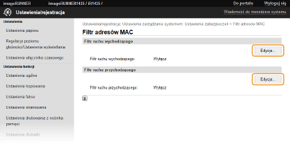 Sprawdzanie poprawności adresów Nieprawidłowo wprowadzone adresy MAC mogą uniemożliwić dostęp do urządzenia z poziomu Zdalnego interfejsu użytkownika. Konieczne będzie wtedy ustawienie filtra <Filtr adresów MAC> na wartość <Wyłącz>. Filtr adresów MAC