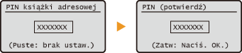 Dostępna jest funkcja ustawienia kodu PIN do książki adresowej dla operacji dodawania nowych i edycji istniejących kontaktów w książce. Ustawienie kodu PIN do książki adresowej może zmniejszyć ryzyko wysłania dokumentów do przypadkowych odbiorców, ponieważ zmian w książce mogą dokonywać wyłącznie użytkownicy, którzy znają kod PIN.
