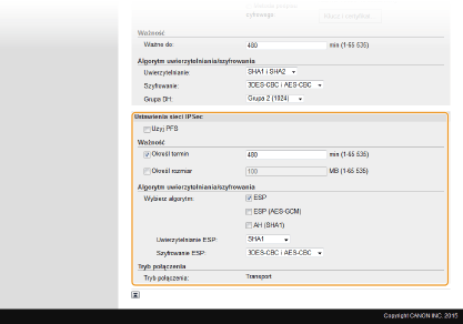 Aby włączyć funkcję uwierzytelniania z użyciem protokołu ESP, wybierz opcję [SHA1] dla algorytmu hashowania. Wybór opcji [Nie używaj] oznacza wyłączenie funkcji uwierzytelniania z użyciem protokołu ESP.