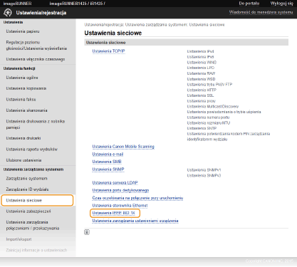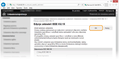 Urządzenie i serwer uwierzytelniania uwierzytelniają się wzajemnie, sprawdzając poprawność swoich certyfikatów. Para kluczy wystawiona przez urząd certyfikacji (CA) jest wymagana do uwierzytelnienia klienta (podczas uwierzytelniania urządzenia). W przypadku uwierzytelniania serwera oprócz certyfikatu fabrycznie zainstalowanego na urządzeniu można użyć certyfikatu CA zainstalowanego za pośrednictwem Zdalnego interfejsu użytkownika. Metody TLS nie można używać jednocześnie z protokołami TTLS lub PEAP.
