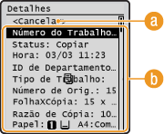 Aparecem itens como o número de cópias, definições e outros detalhes. Se pretender apenas verificar os detalhes sem cancelar a cópia, prima  (Controlo de Estado) para regressar ao ecrã principal de cópia.