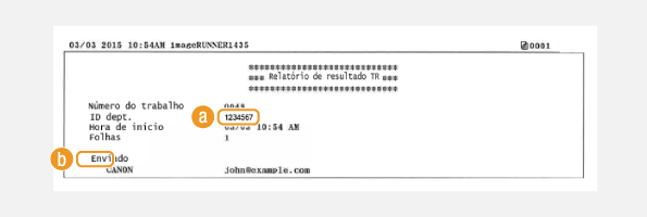 Aparece o nome e o endereço ou nome de anfitrião do destino. Se enviar o documento por correio eletrónico, o relatório indica o resultado da transmissão entre a máquina e o servidor de correio, e não entre a máquina e o endereço de destino. Não é impresso um código de erro de três dígitos, mesmo que a transmissão falhe. Para verificar o código de erro, imprima um Relatório de Gestão de Comunicação (