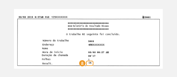 "OK" indica que o fax foi recebido com êxito, enquanto "NG" e três dígitos (código de erro) indica que a comunicação por fax falhou (