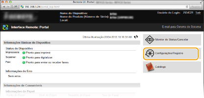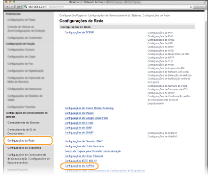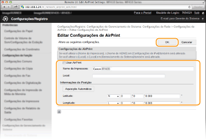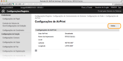 Pode registar informações, incluindo o nome da máquina e o local de instalação, que são utilizadas para identificar a máquina. Também pode desativar a função AirPrint da máquina. Utilize a IU Remota para alterar essas definições.