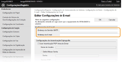 Utilize a IU Remota para configurar definições de correio eletrónico, como informação do servidor SMTP e codificação TLS. Para obter mais informações sobre as definições necessárias, contacte o fornecedor de serviços de Internet ou o administrador de rede.