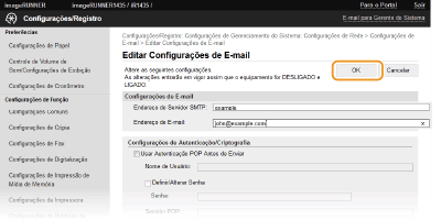 Todas as mensagens de correio eletrónico existentes na caixa de entrada do servidor são eliminadas logo que clicar em [OK] no passo 6. Se especificar um endereço de correio eletrónico para uso quotidiano em [Endereço de E-mail:], tenha cuidado para não apagar mensagens de correio eletrónico não lidas. Para diminuir o risco de apagar mensagens de correio eletrónico não lidas, utilize uma conta de correio eletrónico destinada exclusivamente à máquina.