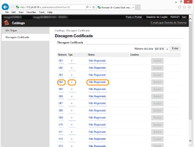 Pode editar um destino gravado clicando na ligação de texto correspondente abaixo de [Número], [Tipo] ou [Nome].