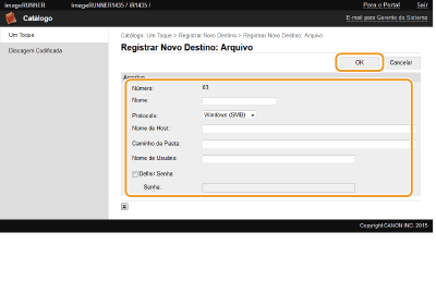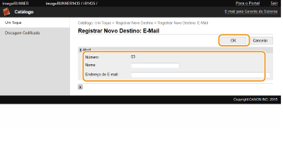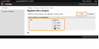 Selecione [E-Mail] ou [Arquivo] em [Tipo de Destino a ser Registrado] e clique em [OK].