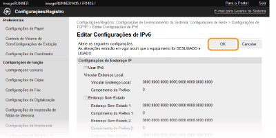 A caixa de verificação [Usar IPv6] tem de estar selecionada para poder configurar as definições. Definir endereços IPv6
