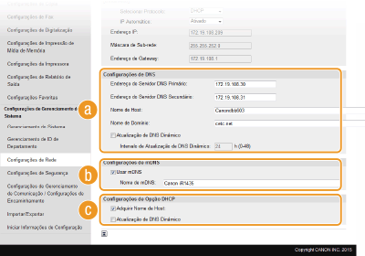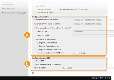 O DNS (Domain Name System) disponibiliza um serviço de resolução de nomes que associa um nome de anfitrião (ou domínio) a um endereço IP. Configure as definições de DNS, mDNS ou DHCP conforme necessário. Tenha em atenção que os procedimentos de configuração de DNS são diferentes para IPv4 e IPv6.