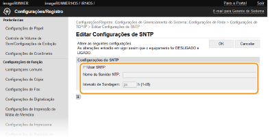 O SNTP (Simple Network Time Protocol) permite ajustar o relógio do sistema utilizando o servidor de hora da rede. O protocolo é normalmente utilizado para sincronizar a máquina e um servidor, tal como acontece, por exemplo, quando a máquina precisa de aceder a um servidor LDAP com a autenticação de segurança que foi ativada. A hora é ajustada com base na hora universal coordenada (UTC), por isso especifique a definição de fuso horário antes de configurar o SNTP (Configurações de Data/Hora). É possível especificar as definições de SNTP através da IU Remota.