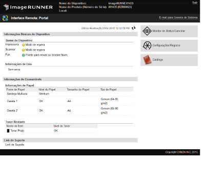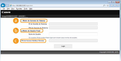 Pode efetuar todas as operações da IU Remota e configurar todas as definições. Introduza o ID adequado em [ID do Gerente do Sistema:] e o PIN em [PIN do Gerente do Sistema:] (