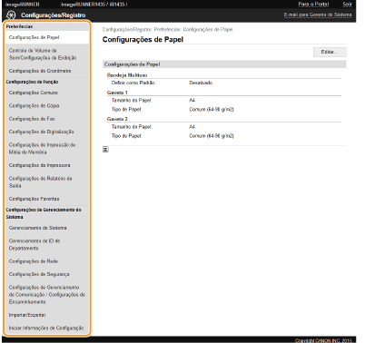 Só pode alterar as definições em [Configurações de Gerenciamento do Sistema] se tiver iniciado sessão no Modo de Administrador de Sistema.