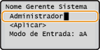 Introduza até 32 carateres para o nome do administrador de sistema, selecione <Aplicar> e prima  . Introduzir texto