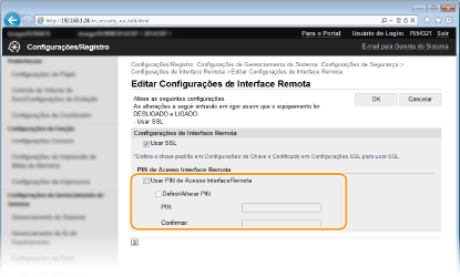 <Config. de Gerenciamento do Sistema> <Configurações de Interface Remota> <Confs. Segurança Acesso Interface Remota> <Ativado> Introduzir PIN <Aplicar> Introduzir PIN (Confirmar) <Aplicar> .Se as definições de IU Remota forem inicializadasO PIN de acesso à IU Remota também é inicializado. Após uma inicialização, reponha o PIN. Inicializar o menu