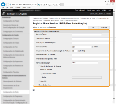 Se estiver selecionada a caixa de verificação [Usar ID do Gerente do Sistema], introduza o nome de utilizador do administrador do servidor LDAP no formato "(nome de utilizador)" (Exemplo: ldap1).