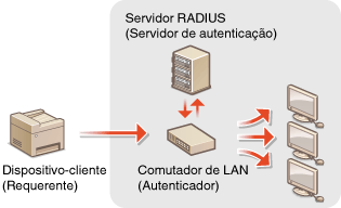 IEEE 802.1X é uma norma e um mecanismo utilizado para bloquear acesso não autorizado à rede através de uma gestão coletiva de dados de autenticação de utilizadores. Se um dispositivo tentar estabelecer ligação à rede 802.1X, o dispositivo tem de passar por uma autenticação de utilizador para provar que a ligação é feita por um utilizador autorizado. Os dados de autenticação são enviados e verificados por um servidor RADIUS, que permite ou rejeita a comunicação destinada à rede, dependendo do resultado da autenticação. Se a autenticação falhar, um comutador de LAN bloqueia o acesso proveniente do exterior da rede. A máquina pode estabelecer ligação a uma rede 802.1X como um dispositivo-cliente. Configurar a autenticação IEEE 802.1X