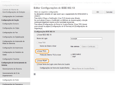 Este método de autenticação utiliza um nome de utilizador e uma palavra-passe para a autenticação do cliente, e um certificado AC para a autenticação do servidor. É possível selecionar MSCHAPv2 ou PAP como protocolo interno. É possível utilizar TTLS com PEAP simultaneamente. Ative a função TLS para a IU Remota antes de configurar este método de autenticação (