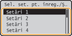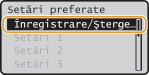 <Setări favorite> <Înregistrare/Ştergere> selectaţi setarea <Ştergere> <Da> .Setările înregistrate sunt salvate chiar dacă aparatul este OPRIT.
