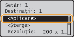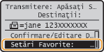 <Setări favorite> <Înregistrare/Ştergere> selectaţi setarea editaţi setarea <Aplicare> <Da> . Nu puteţi modifica destinaţiile înregistrate în setări folosind această procedură. Înregistraţi o nouă setare cu destinaţiile dorite.Dacă doriţi să ştergeţi o setare înregistrată, apăsaţi