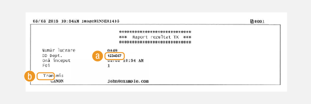 Sunt afişate numele şi adresa sau numele gazdei pentru destinaţie. Dacă aţi trimis documentul prin e-mail, raportul indică rezultatul transmiterii între aparat şi serverul de mail, nu între aparat şi adresa destinatarului. Nu va fi imprimat un cod de eroare de trei cifre, chiar dacă transmiterea nu s-a realizat. Pentru a verifica codul de eroare, imprimaţi un Raport Gestionare Comunicaţii (