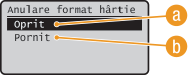 <Fomat hârtie implicit> şi <Tip hârtie implicit> nu pot fi specificate separat. Specificaţi dimensiunea hârtiei în ecranul <Fomat hârtie implicit> şi apoi specificaţi tipul hârtiei în ecranul <Tip hârtie implicit>.