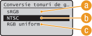 Selectaţi <sRGB>, <NTSC> sau <RGB uniform>
