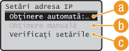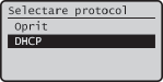 Dacă nu doriţi să folosiţi DHCP pentru a atribui adresa IP Selectaţi <Oprit>. Când selectaţi <DHCP> când serviciul DHCP nu este disponibil, aparatul va căuta dacă serviciile sunt disponibile în reţea şi vor avea loc comunicaţii care nu sunt necesare. |