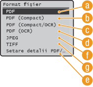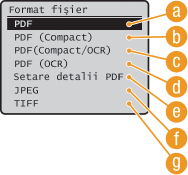 Puteţi selecta din şase tipuri de formate pentru fişier în care documentele sunt transformate: <PDF>, <PDF (Compact)>, <PDF (Compact/OCR)>, <PDF (OCR)>, <JPEG> şi <TIFF>. Documentele scanate sunt transformate în formatul fişierului specificat aici şi apoi trimise la destinaţia specificată.