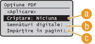 * Unele elemente sunt disponibile numai când este activată funcţia opţională Set de funcţii de securitate la trimiterea fişierelor PDF.