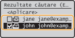 Dacă ecranul de autentificare apare când începeţi să căutaţi, introduceţi numele de utilizator şi parola înregistrată în serverul LDAP, selectaţi <Aplicare> şi apăsaţi . Puteţi introduce numele de utilizator şi parola dumneavoastră sau ale aparatului, în funcţie de setare (Înregistrare servere LDAP). Dacă nu sunteţi sigur, întrebaţi-l pe administratorului reţelei.