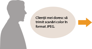 Specificaţi adresa de e-mail a clientului cu <Color> şi <JPEG> pentru setări scanare şi înregistraţi adresa şi setările ca o combinaţie în <Setări favorite>. Înregistrarea setărilor folosite frecvent la scanare (E-mail/Server de fişiere)