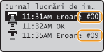 Apare un număr de trei cifre (cod de eroare) pe un raport sau este afişat ecranul <Monitor de stare> dacă apare o eroare, precum eşuarea imprimării sau umplerea memoriei. Verificaţi informaţiile de mai jos pentru detalii despre cauzele şi soluţiile pentru fiecare cod de eroare. Pentru detalii despre informaţii în raport şi cum să le imprimaţi, consultaţi