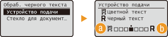 При сканировании цветных документов можно настроить цвет черного или черноватого текста для большего соответствия оригинальному документу либо настроить четкость черного текста для удобства его чтения. Настройки параметров можно выполнить отдельно для устройства подачи и стекла экспонирования.