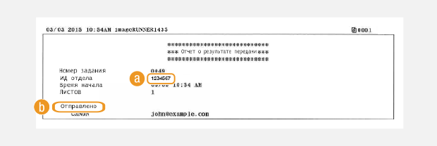 Отображаются имя и адрес или имя хоста адресата. Если документ отправлен по электронной почте, в отчете приводятся результаты передачи данных между аппаратом и почтовым сервером, а не между аппаратом и адресатом. Трехзначный код ошибки не выводится на печать даже в том случае, если выполнить передачу не удалось. Для того чтобы проверить код ошибки, выполните печать отчета об управлении связью (