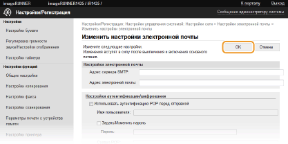 Все сообщения электронной почты на сервере удаляются при нажатии кнопки [OK] на шаге 6. Если в разделе [Адрес электронной почты:] указан адрес электронной почты для повседневного использования, будьте внимательны, чтобы не удалить непрочитанные сообщения. Чтобы уменьшить риск удаления непрочитанной почты, используйте учетную запись электронной почты, выделенную специально для этого аппарата.