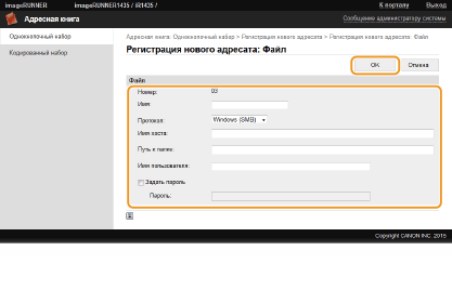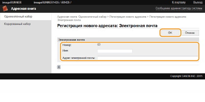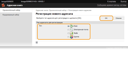 Выберите кнопку [Электронная почта] или [Файл] в пункте [Тип адресата для регистрации] и нажмите кнопку [OK].