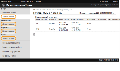 Отображаются журналы печати, копирования, передачи факсов/сообщений электронной почты/файлов (ПЕР) или приема факсов (ПР). Можно просмотреть до 128 последних заданий по каждой функции (50 заданий на копирование).