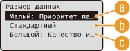 Можно указать коэффициент сжатия файла, применяемый при сканировании документов в указанном формате файла (Выбор формата файла). Настройка <Малый: Приоритет памяти> увеличивает коэффициент сжатия по сравнению с нормальным, чтобы создавать файлы меньшего размера с более низким качеством изображения. С другой стороны, настройка <Большой: Приоритет качества изображения> уменьшает коэффициент сжатия по сравнению с нормальным, чтобы создавать файлы большего размера с более высоким качеством изображения.