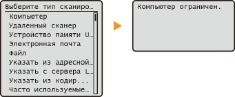 Если установлен флажок [Сканирование], сканирование документов на устройства памяти USB, в электронную почту и на файловые серверы отключается. Вы также можете отключить сканирование документов на компьютерах через <Компьютер> и <Удаленный сканер>. Однако отключить сканирование документов на компьютеры можно только для всех идентификаторов отделов. (Блокировка заданий при неизвестном ИД отдела).