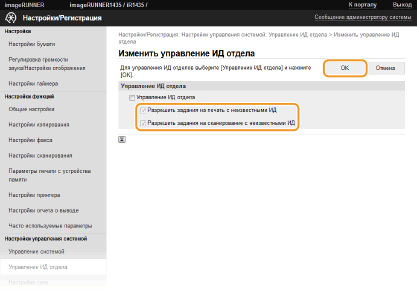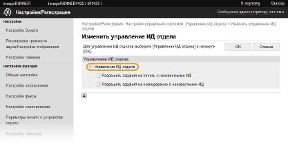 Установите флажок [Use Department ID Management] (Использовать управление ИД отдела) и нажмите кнопку [Settings] (Настройки) справа от него.