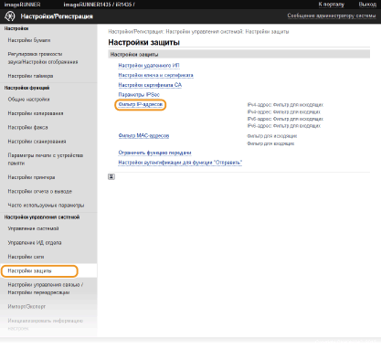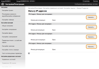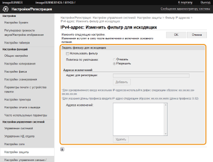 Проверка на ошибки ввода При неправильном вводе IP-адресов доступ к аппарату с удаленного ИП может быть заблокирован. В этом случае необходимо установить для параметра <Фильтр IPv4-адресов> или <Фильтр IPv6-адресов> значение <Выкл.>. Фильтр IPv4-адресов Фильтр IPv6-адресов
