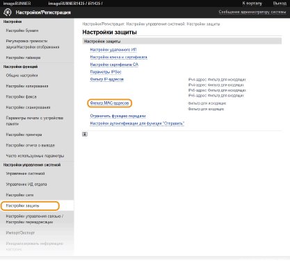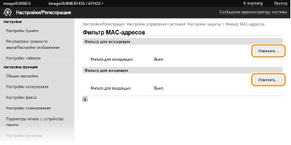 Проверка на ошибки При неправильном вводе MAC-адресов доступ к аппарату с удаленного ИП может быть заблокирован. В этом случае необходимо указать для параметра <Фильтр MAC-адресов> значение <Выкл.>. Фильтр MAC-адресов